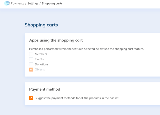 By default, the cart will use all payment methods configured in the account. However, it is possible to change this behavior via the shopping cart settings in Payments > Settings > Shopping Carts.