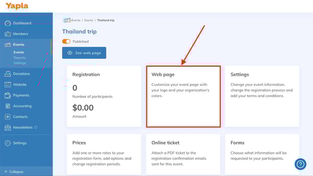 Click on "Events" in the main menu on the left-hand side of your screen to access the link to your page, as well as the various options for broadcasting it. Click on the event of your choice, then click on the "Web Page" tile, then on the "Diffusion of your event" sub-tab.