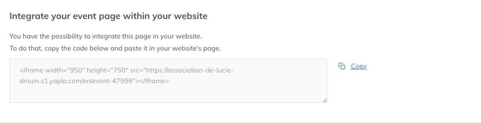 You can simply integrate a redirect button to your event, or with Yapla's integration functionality, you can generate an IFRAME. This is a window to an existing web page from another web page, and where interactions are possible directly from the latter.