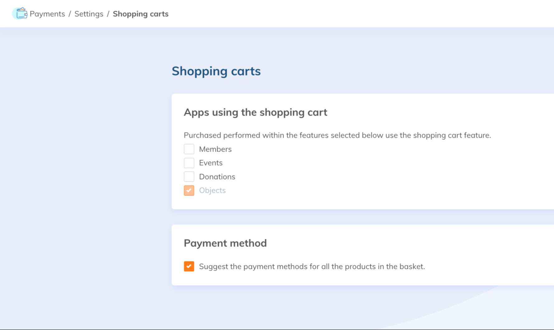 Go to Payments > Settings > Shopping Carts.