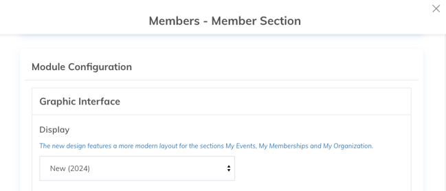 Now you can choose the (New 2024) display mode. It will apply for the My Events, My Memberships and My Organization pages under Module Configuration > Graphic Interface > Display.
