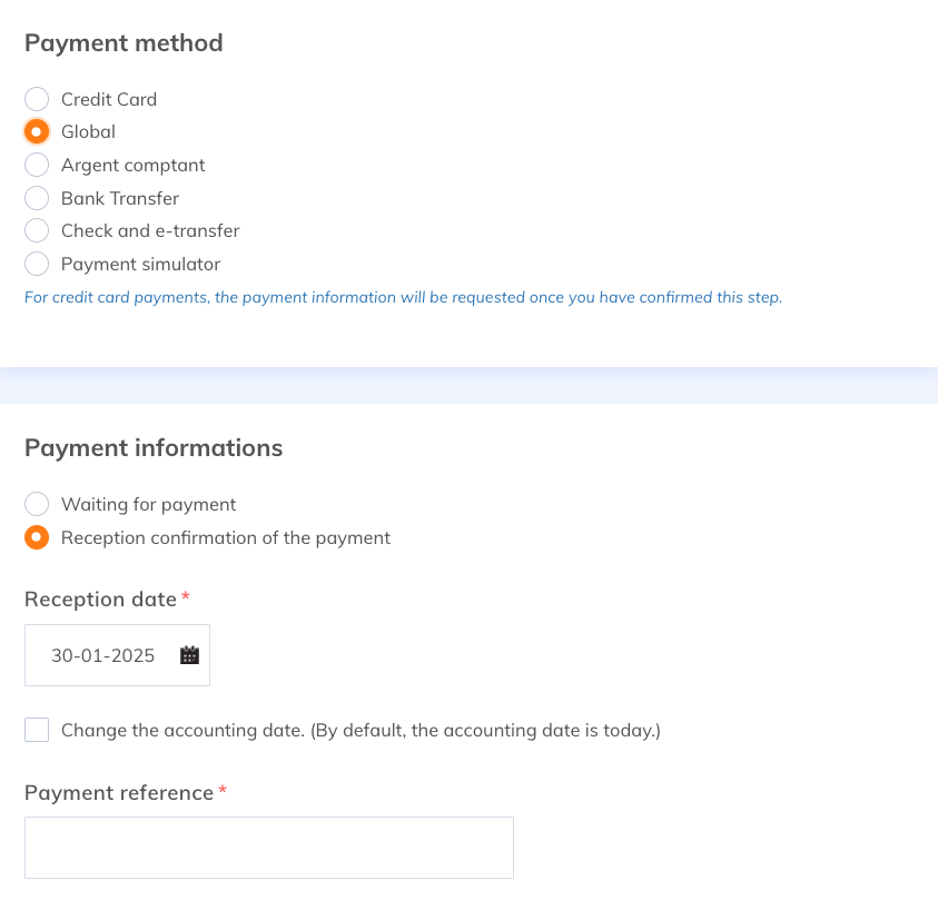 - At the payment step, choose the desired payment method based on the accepted payment options. For payments other than credit cards, you will have the option to indicate whether the payment has been received and confirmed (sends a payment receipt to the participant) or if it is still pending (sends an invoice to be paid by the participant). Credit card payments will be processed in the next step.