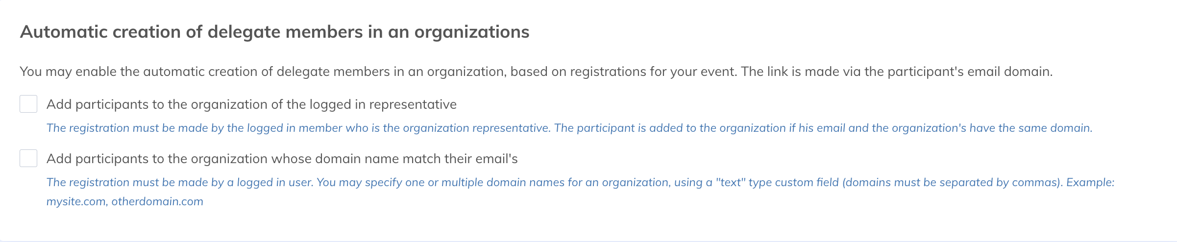 - Automatic creation of delegate members in an organization - If you wish to automatically create delegated members in an organization during registration, select the desired procedure.