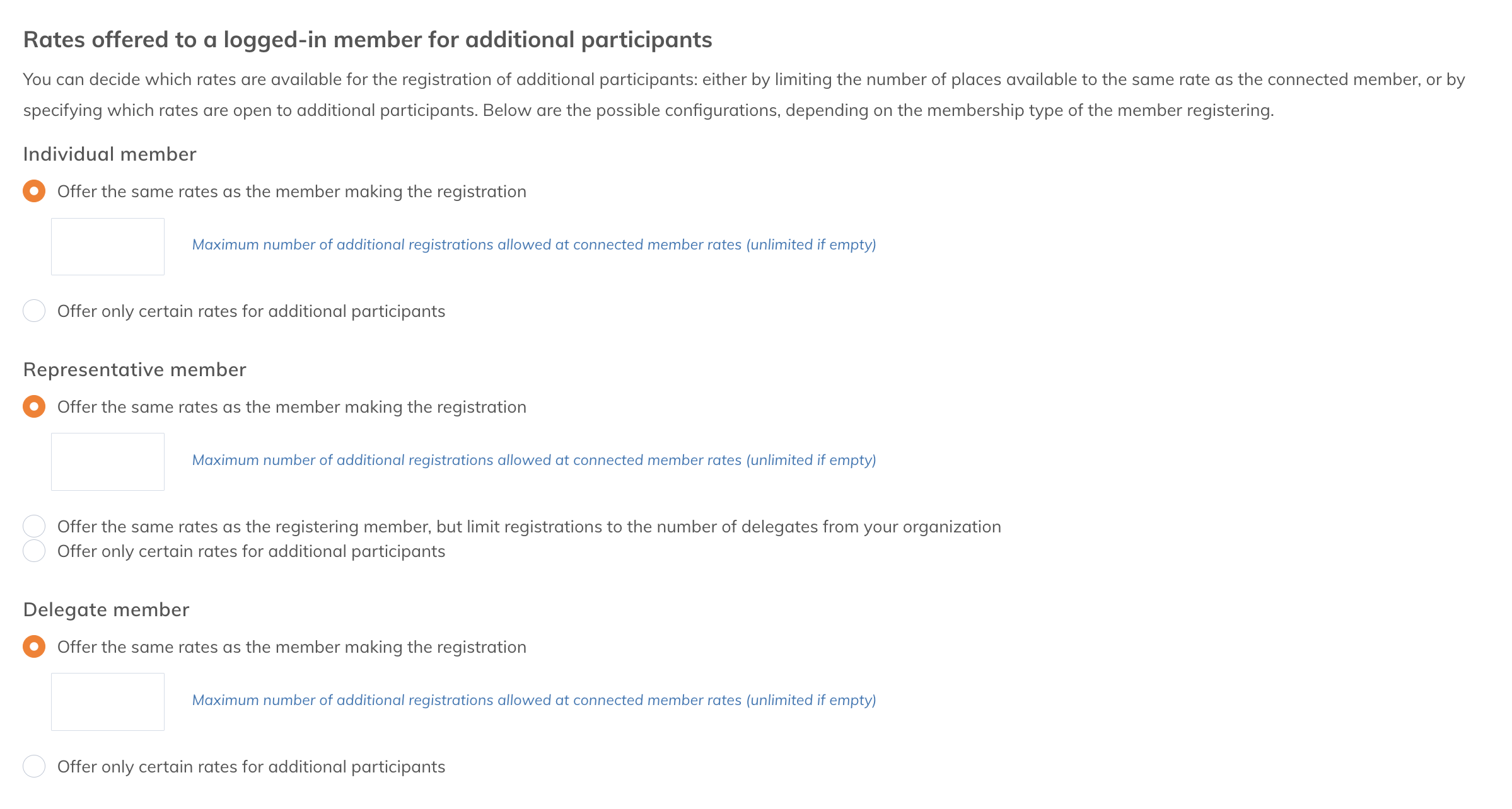 - Offer the same rates as the member registering: All additional participants will have the same rate. You can set a limit for additional registrations. The registering member is included in the total allowed registrations.