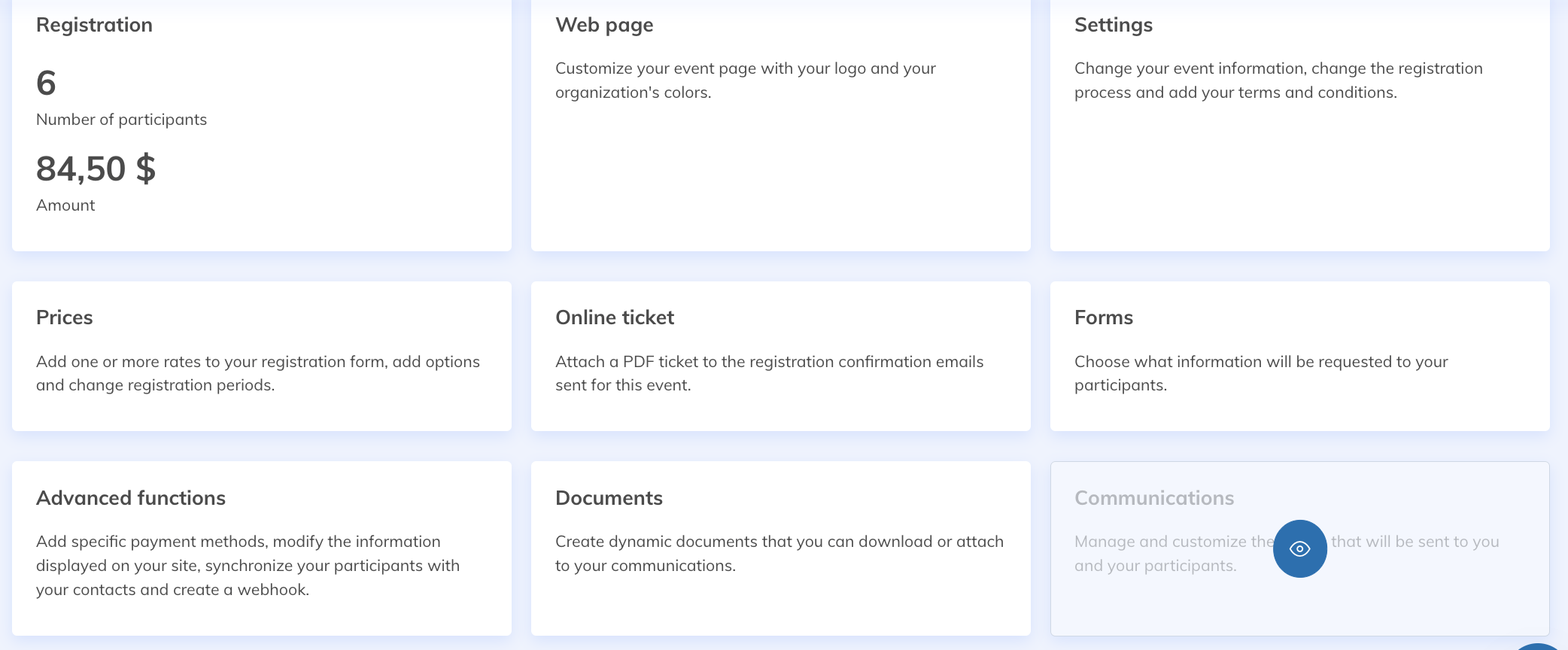 Go to your event and select the Communications tile. You will find the list of available communications and their triggers. Customize and configure communications according to your needs. To learn more about how communications work, check this article.
