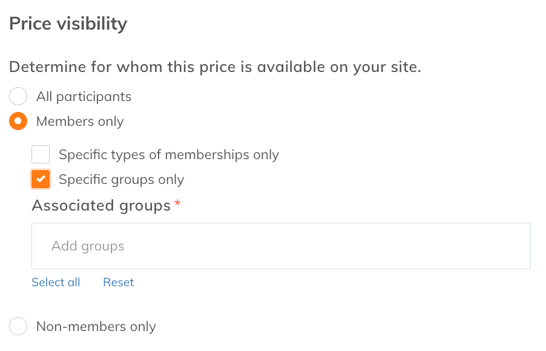 Specific groups only: Display a rate only to members belonging to specific groups. See our article on custom groups to learn more. This allows you to further segment rate visibility to certain logged-in members who are part of those groups.