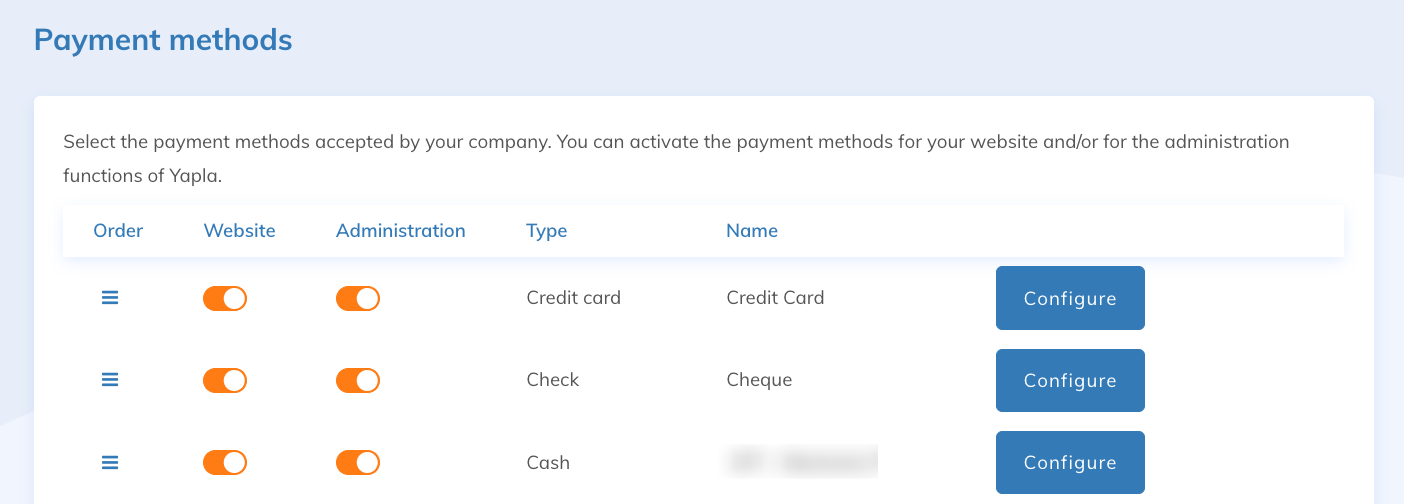 The Website and Administration columns let you disable a payment method in the environment of your choice. The Website column controls payment methods for your web pages, intended for your clients, while the Administration column controls the payment methods visible to administrators in Yapla.