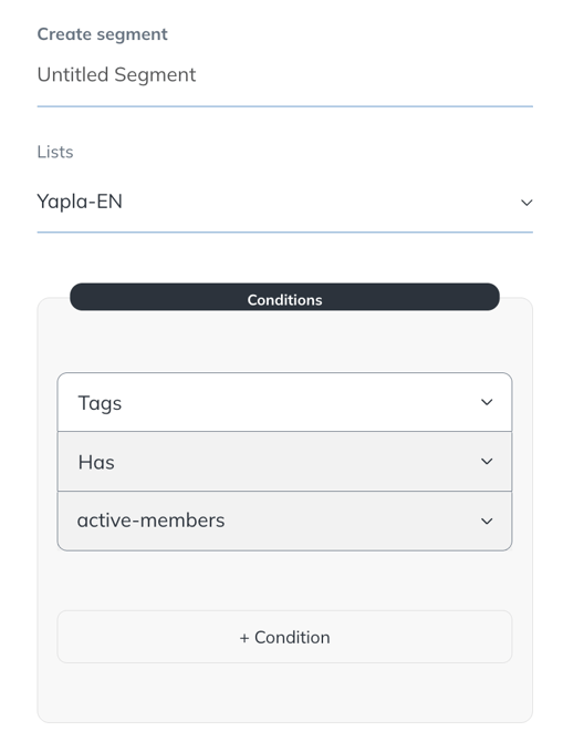 Under the desired contact list, click Create a segment. On the left column, give your segment a title—ideally "Active-members". Under Conditions, select the option "Tags" on the first line, "Has" on the second, and "active-members" on the last.