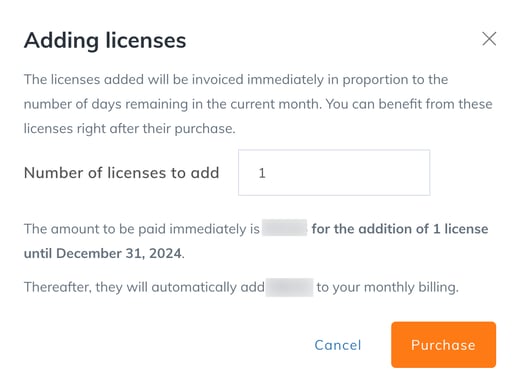 After clicking on the button, indicate the number of licenses to add and click on Buy.