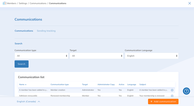 Communications related to each feature can be found in their respective settings. You will find the list of available communications for each activated language. For example, for the Members application, find them in Members > Settings > Communications.