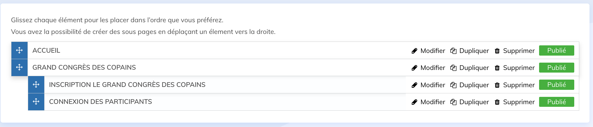 La liste des pages vous permet d'organiser vos pages et de créer des onglets et des sous-onglets au menu de votre site web. Dans la liste des pages, glissez les pages pour les mettre en retrait sous une page souhaitée. Si vous souhaitez cacher une page du menu de votre site, sélectionnez-la, rendez-vous dans l'onglet Configuration et cochez le paramètre Ne pas afficher cette page dans le menu de votre site web.