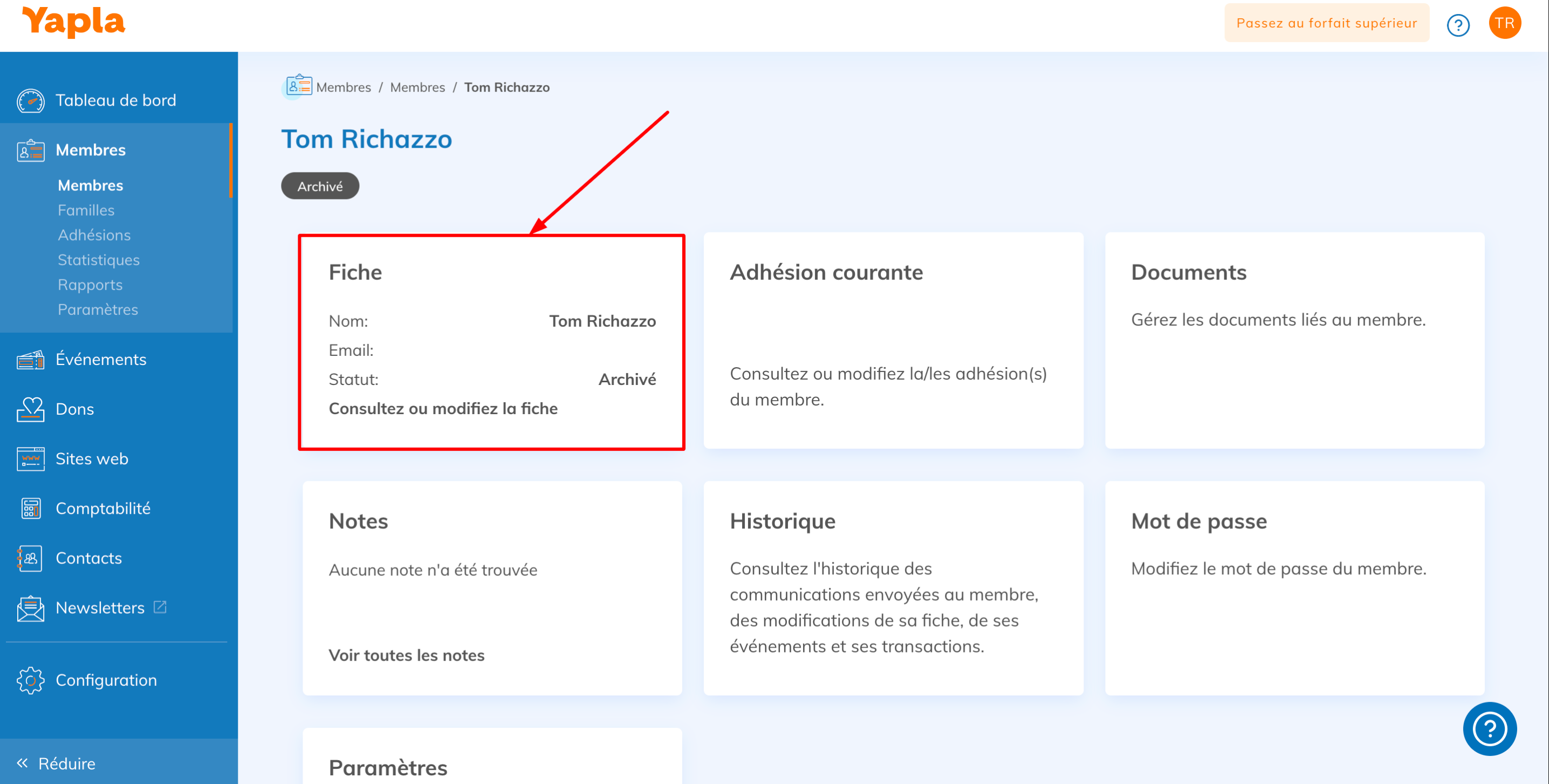 Pour restaurer un membre, cliquez sur le membre en question puis allez dans "Fiche" (voir ci-dessous) :