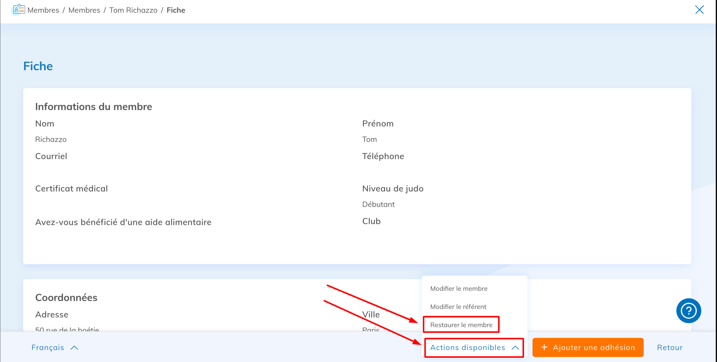 Une fois dans la fiche de la personne, vous pourrez le récupérer en cliquant en bas à droite sur "Actions disponibles" puis sur "Restaurer le membre" (voir ci-dessous) :
