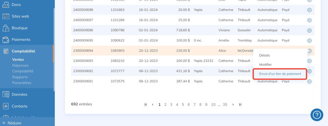 Une fois que le panier est créé, vous pouvez envoyer un lien de paiement. Dans Comptabilité, envoyez le lien de paiement à la personne concernée en cliquant sur l'icône de roulette.
