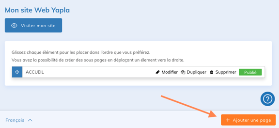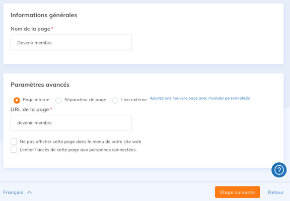 En bas à droite, cliquez sur Ajouter une page. À cet endroit, vous pouvez inscrire l’URL de la page et lui donner un nom, par exemple : « Espace membre » ou bien « Adhérents ».