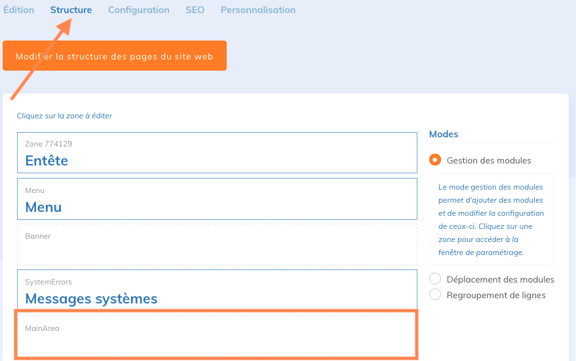 Pour ajouter votre campagne d’adhésion dans cette page, cliquez sur la page que vous venez de créer puis choisissez Structure. Ensuite, sélectionnez la zone de la page où vous souhaitez ajouter votre campagne d’adhésion (nous vous recommandons d’utiliser la zone MainArea, c’est-à-dire le centre, pour ajouter votre campagne d’adhésion).