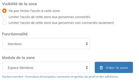 Dans le champ Fonctionnalité, sélectionnez Membres. Ensuite, dans le champ Module de la zone, sélectionnez Espace membres.