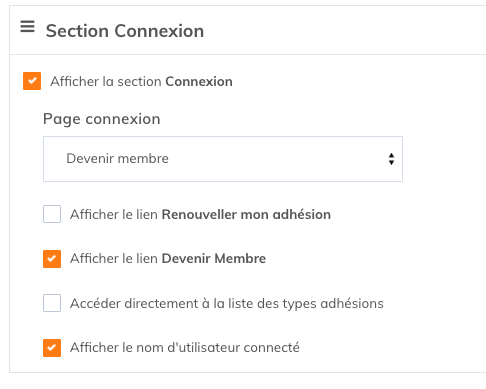 Dans l’en-tête de votre site, nous vous conseillons fortement de créer des boutons d’appel à l’action avec, par exemple, un bouton Connexion, ou encore, un bouton Renouveler mon adhésion. Cela facilite la recherche de vos visiteurs et met les actions qu’ils peuvent entreprendre à leur disposition.