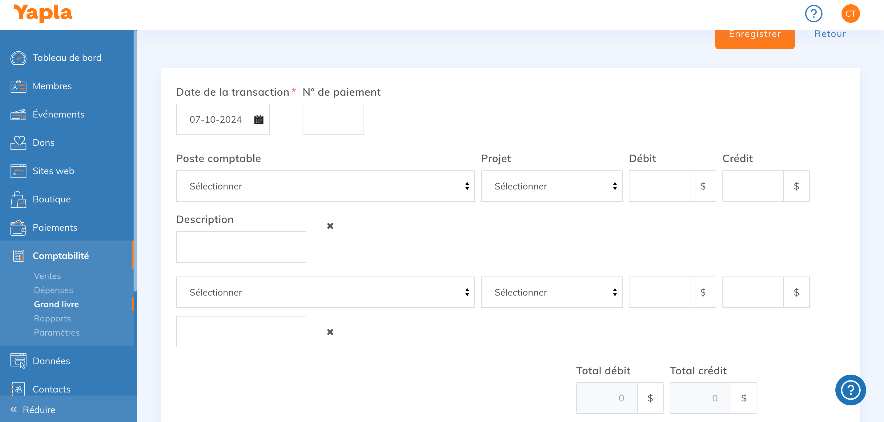 Vous pouvez choisir la date de la transaction, et entrer, pour chaque ligne comptable, les informations suivantes :