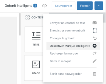 Si vous souhaitez modifier des éléments en lien avec votre image de marque dans un gabarit intelligent, à partir d'un gabarit intelligent, sélectionnez la flèche dans le coin supérieur droit et cliquez sur Désactiver Marque intelligente.