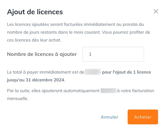 Après avoir cliqué sur le bouton, indiquez le nombre de licences à ajouter et cliquez sur Confirmer.