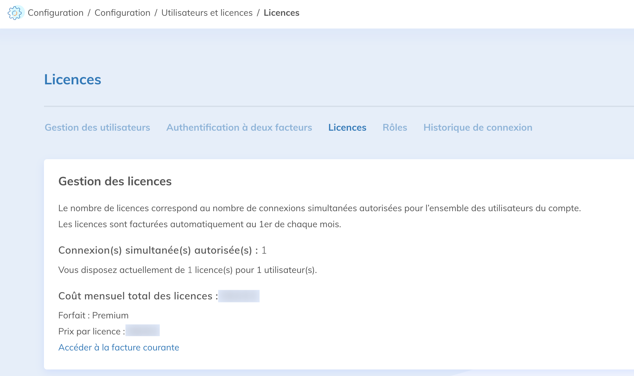 Pour changer le nombre de licences, ouvrez le menu Configurations, puis cliquez sur la tuile Utilisateurs et licences. Cliquez ensuite sur le sous-menu Licences.