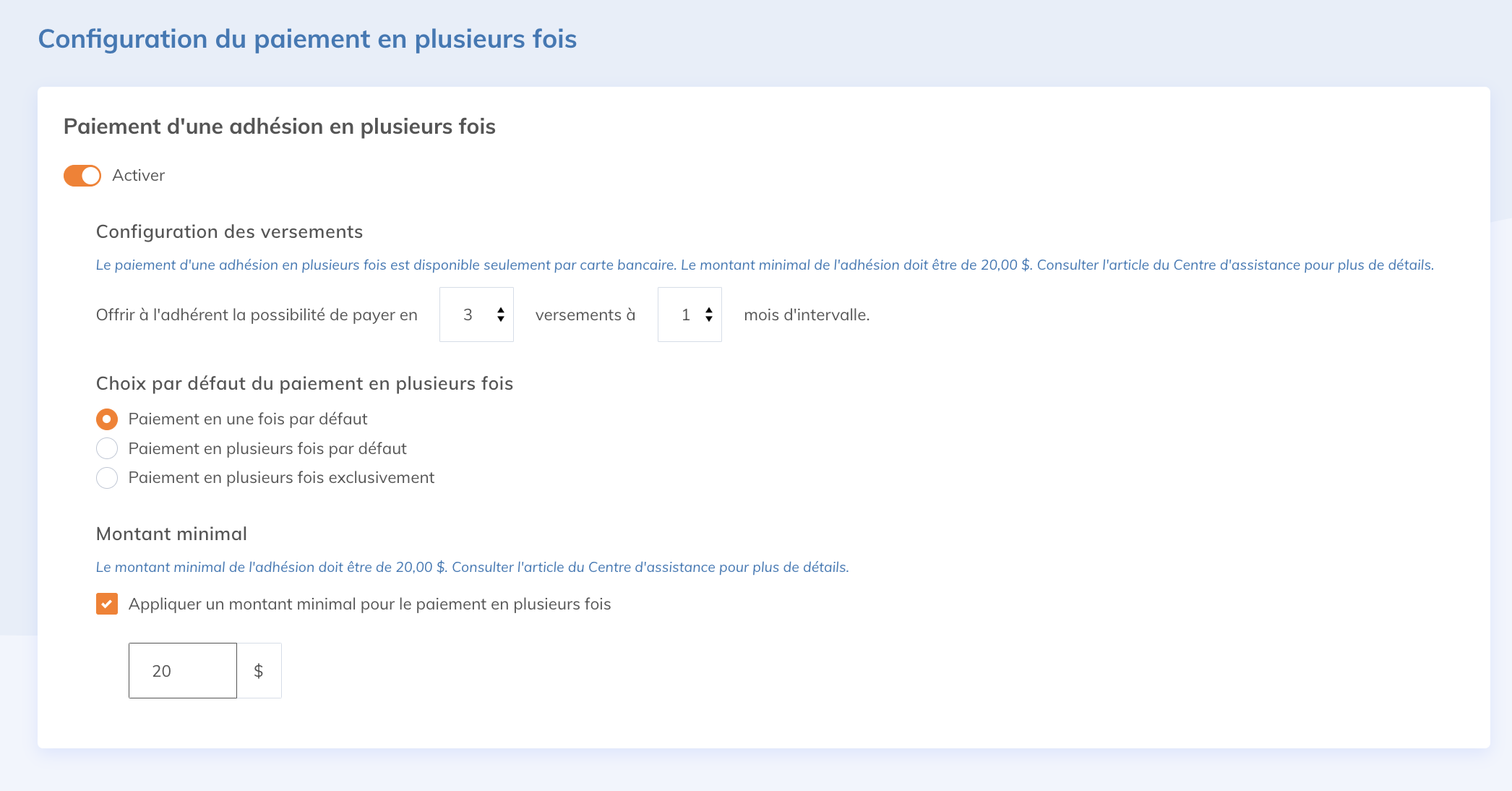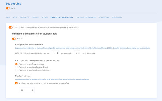 Il est aussi possible d'offrir uniquement le paiement en plusieurs fois ou déterminer un montant minimum à partir duquel l'option est disponible pour le membre.
