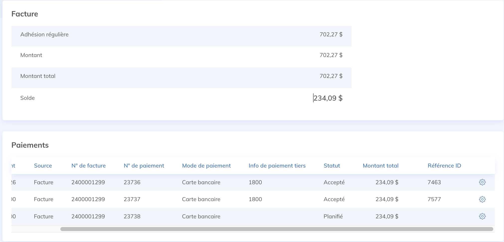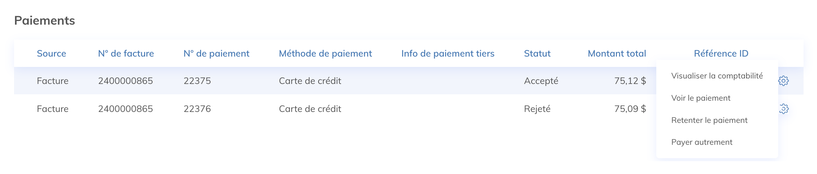 Dans la section Paiements, en bas, cliquez sur la roue dentée près du paiement rejeté. Vous pourrez ainsi retenter le paiement ou choisir de payer autrement.