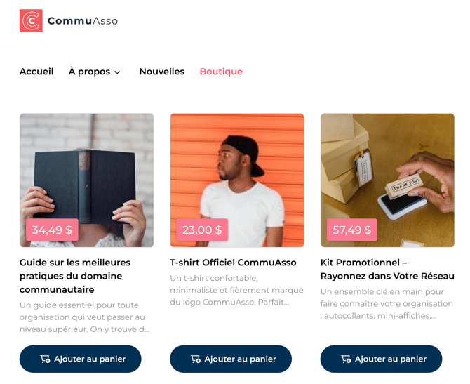 Votre site web contiendra maintenant un nouvel espace qui affichera tous vos produits configurés dans votre boutique. Les utilisateurs de votre site web pourront ajouter ces produits au panier.