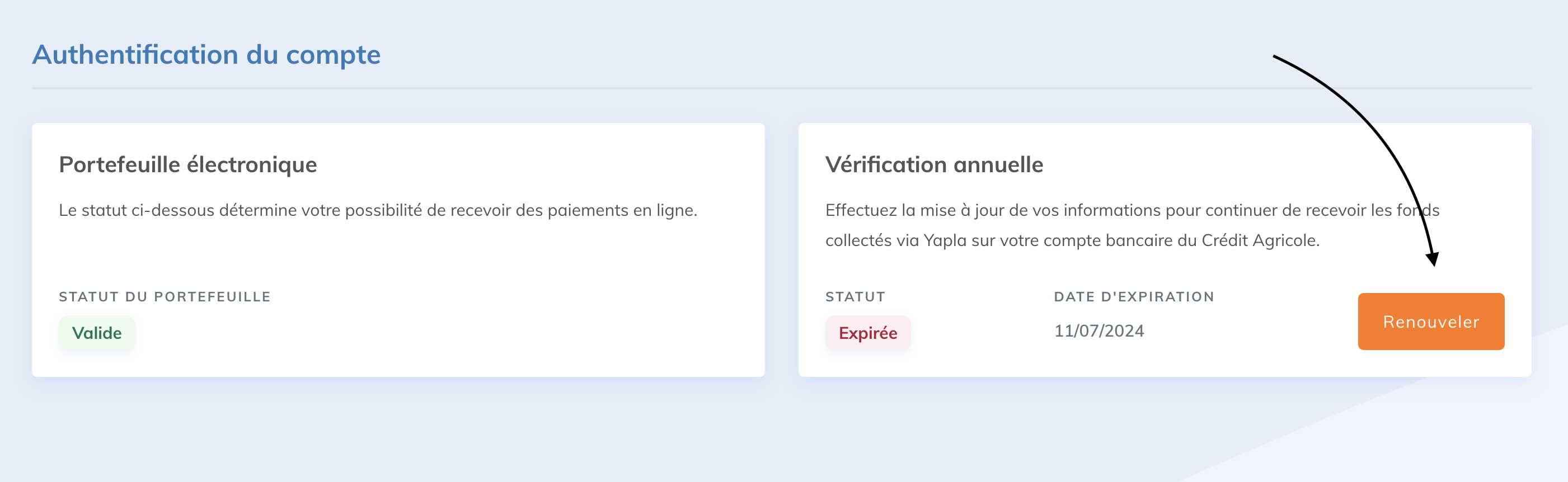 L'authentification de votre compte Yapla doit être renouvelée annuellement pour nous permettre de continuer à vous reverser les fonds collectés sur le compte bancaire Crédit Agricole de votre association.