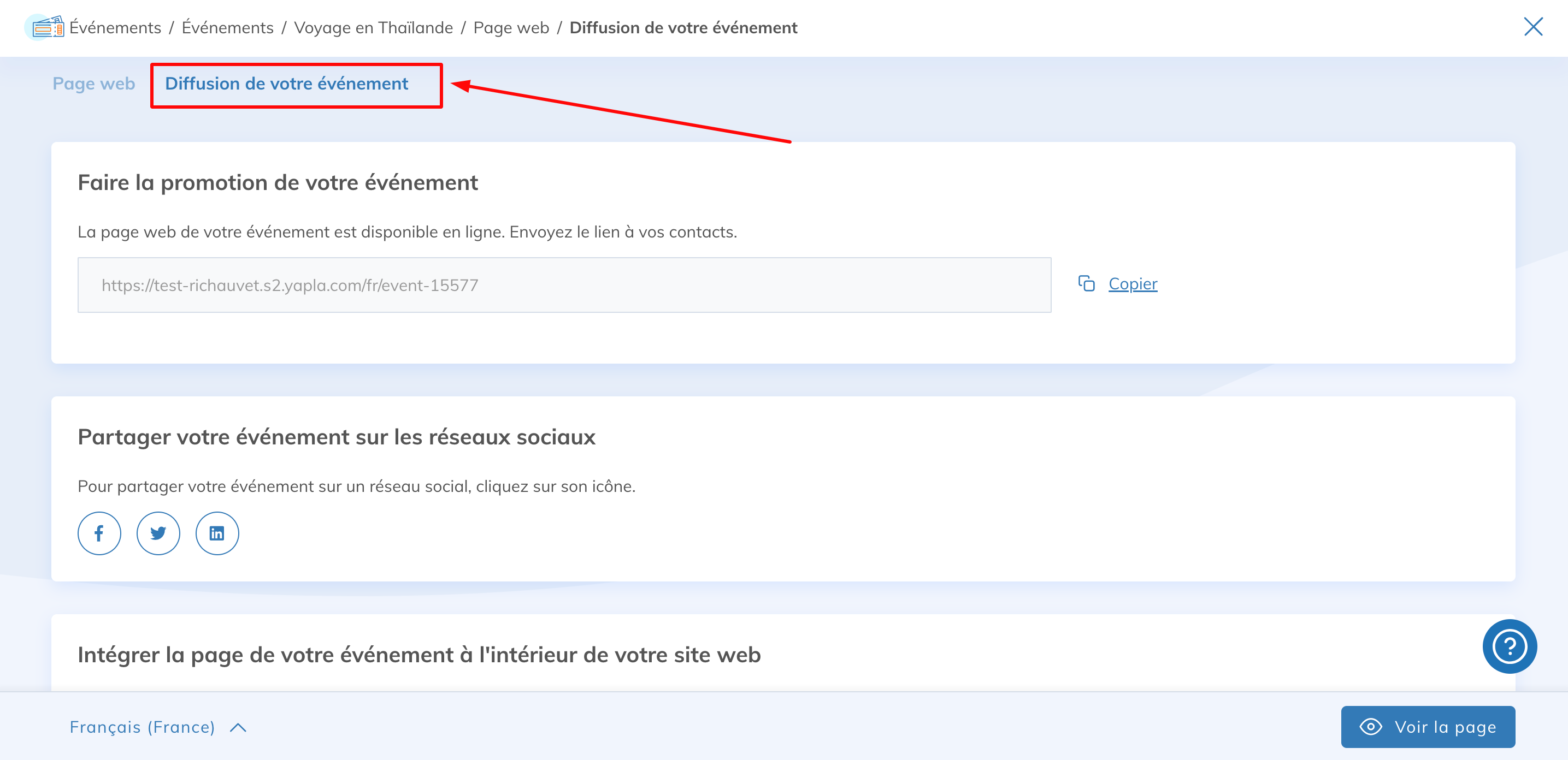 Vous trouverez à cet endroit trois moyens de diffusion de votre événement. C'est notamment à cet endroit que vous retrouverez le lien de événement.