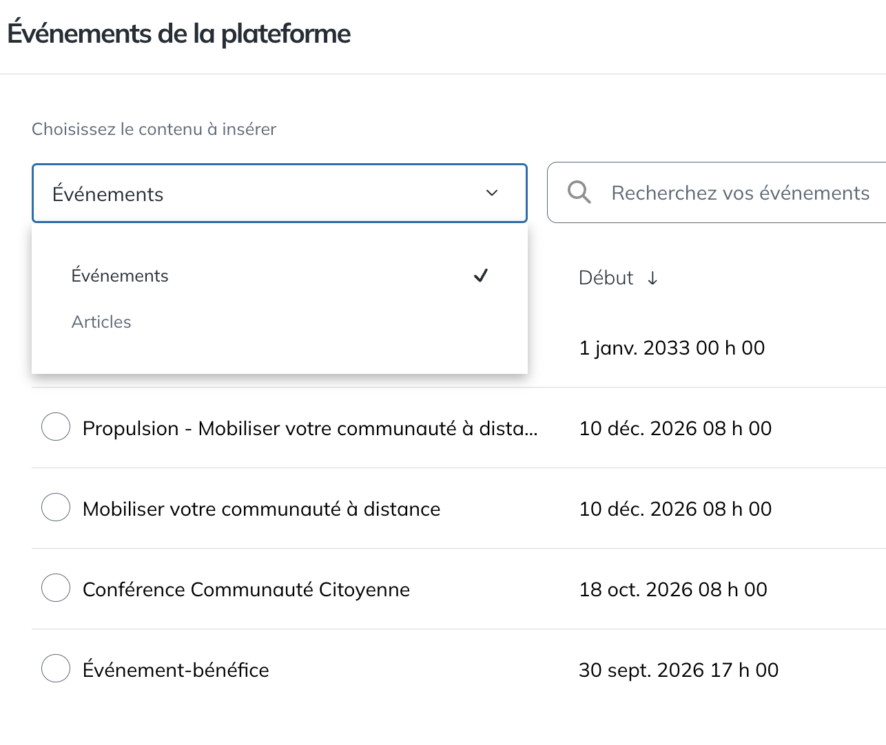 Yapla Newsletter vous permet d'afficher l'information contenue et déjà formatée dans vos événements et articles dynamiquement dans vos newsletters. Cette fonctionnalité vous permet de gagner du temps en y ajoutant les informations clés, comme la date et l'heure, la vignette, des descriptions et des boutons pour rediriger vos lecteurs vers la page d'inscription ou l'article complet.