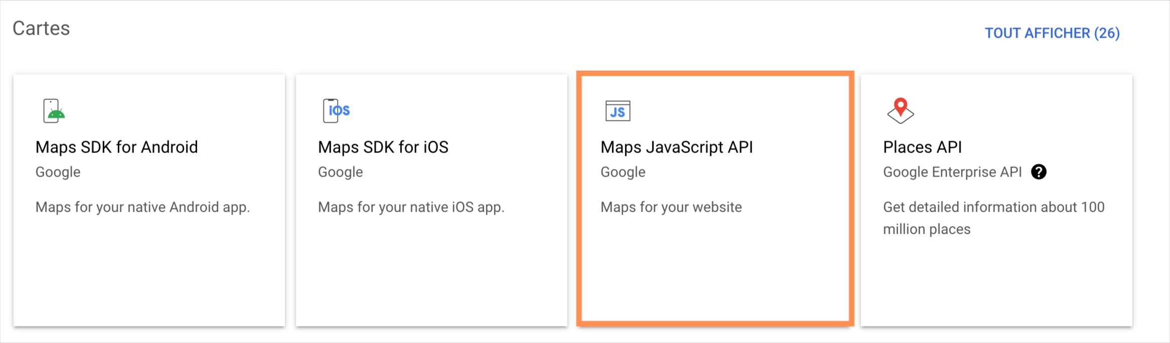 Dans la liste des services qui apparaissent, sélectionnez Maps JavaScript API.