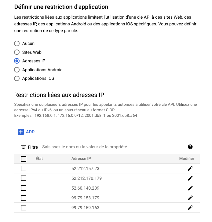 Créez une 2e clé avec une restriction par adresse IP et les adresses suivantes :