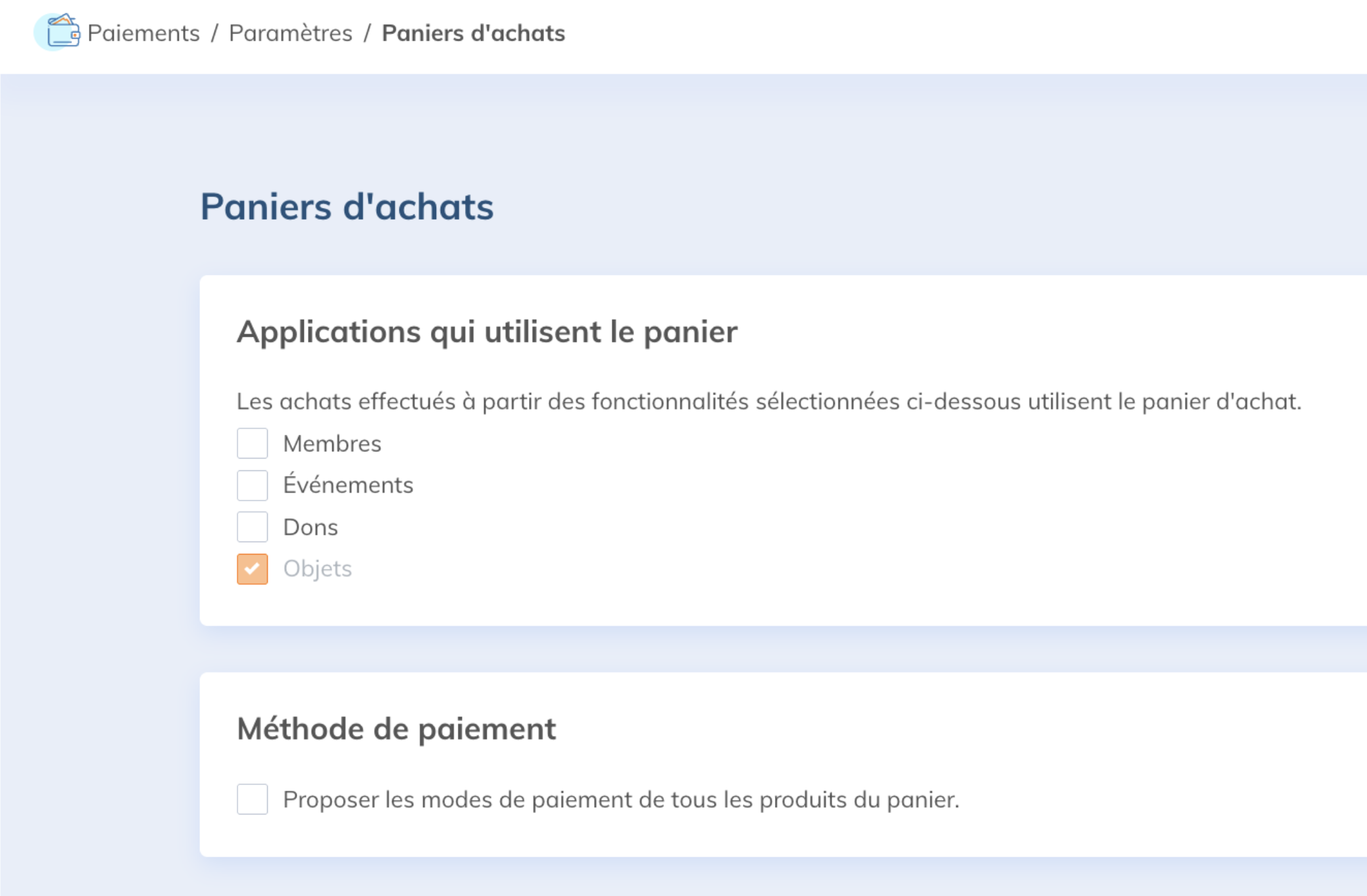 La case Proposer les modes de paiement de tous les produits du panier compilera tous les modes de paiement présents dans le panier au moment du paiement.
