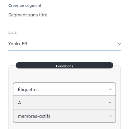 Sous la liste de contacts souhaitée, cliquez sur Créer un segment. Dans la colonne de gauche, attribuez un titre à votre segment - idéalement "Membres actifs". Sous Conditions, sélectionnez l'option "Étiquettes" sur la première ligne, "A" sur la deuxième et "membres-actifs" sur la dernière.