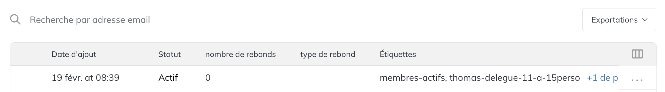 Pour reconnaître les membres actifs dans Yapla newsletters, rendez-vous dans l'onglet Newsletters > Contacts. Dans la liste de vos contacts, tous vos membres actifs dans Yapla posséderont automatiquement l'étiquette "membres-actifs" sous la colonne Étiquettes.