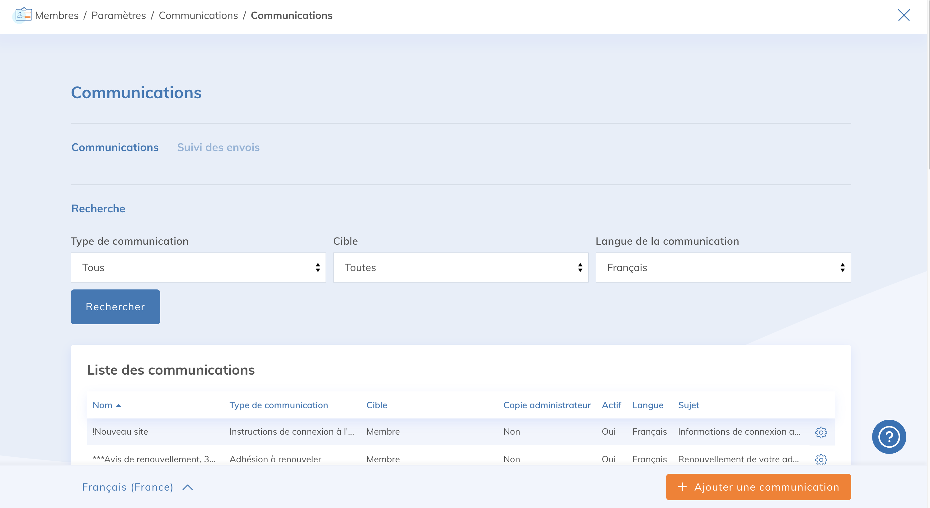 Dans le sous-onglet Suivi des envois, vous retrouverez l'historique des communications envoyées ainsi que l'option d'activer ou de désactiver complètement les communications. Cette option est utile lorsque vous configurez vos communications et souhaitez éviter que des communications soient envoyées par erreur.