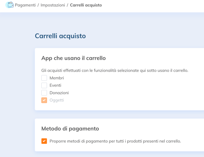Per impostazione predefinita, il carrello utilizzerà tutti i metodi di pagamento configurati nell'account. Tuttavia, puoi cambiare questa modalità tramite i parametri del carrello in Pagamenti > Impostazioni > Carrelli acquisto.