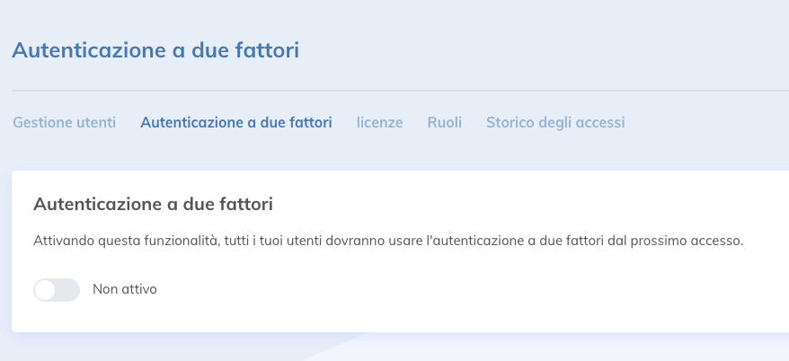 Vai su Impostazioni > Utenti e licenze > Autenticazione a due fattori e disattiva l'opzione.