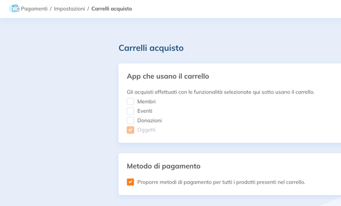 Vai su Pagamenti > Impostazioni > Carrelli acquisto.