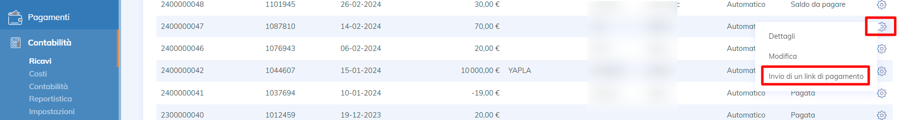 Nella funzionalità Contabilità, invia il link di pagamento alla persona interessata cliccando sull'icona della ruota dentata.