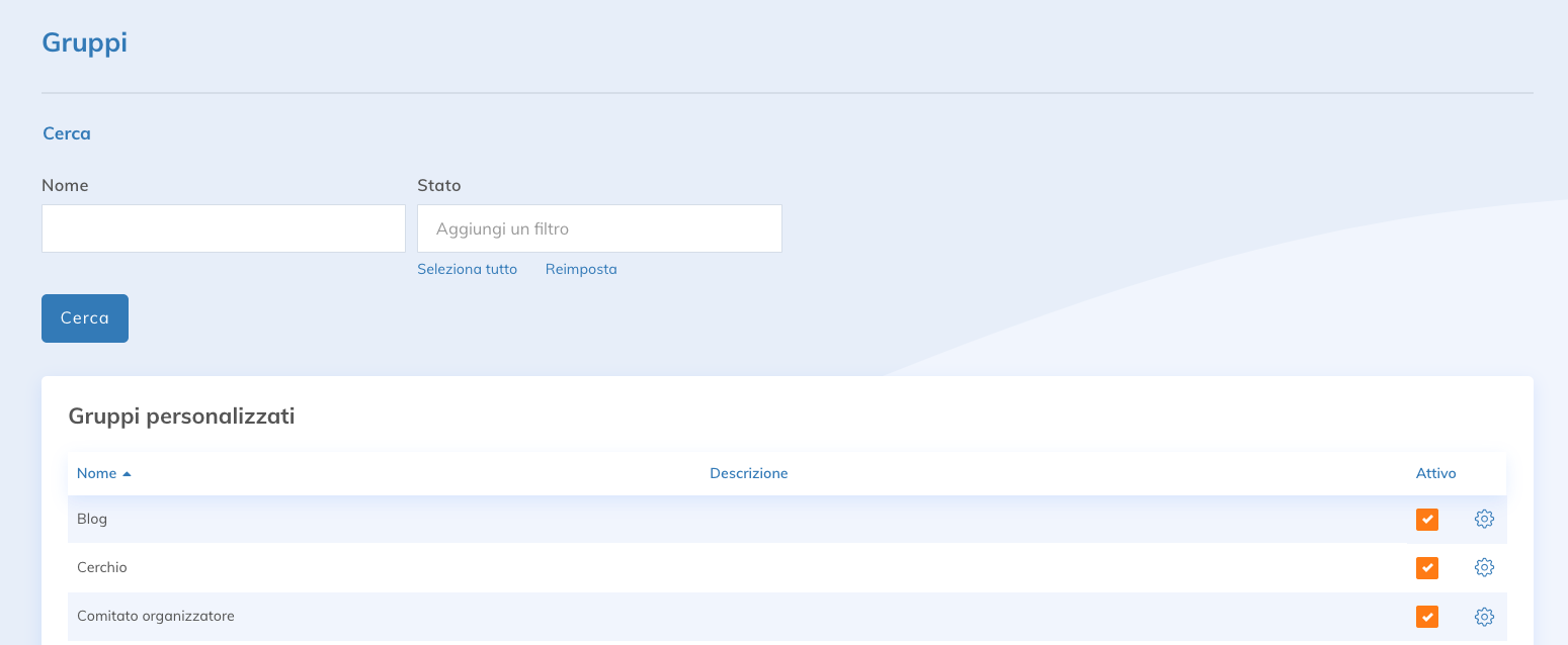 Andando su Configurazione > Gruppi, troverai l'elenco di tutti i gruppi (gruppi personalizzati e gruppi di sistema). Questi gruppi saranno automaticamente sincronizzati in Yapla Newsletter sotto forma di etichette. A partire da queste etichette, puoi creare segmenti di invio.