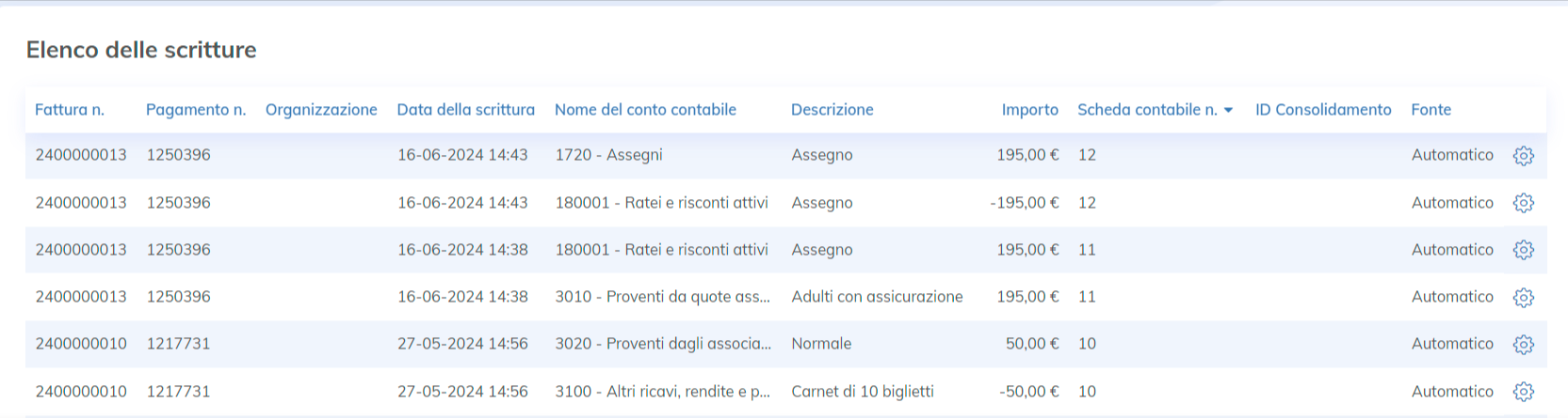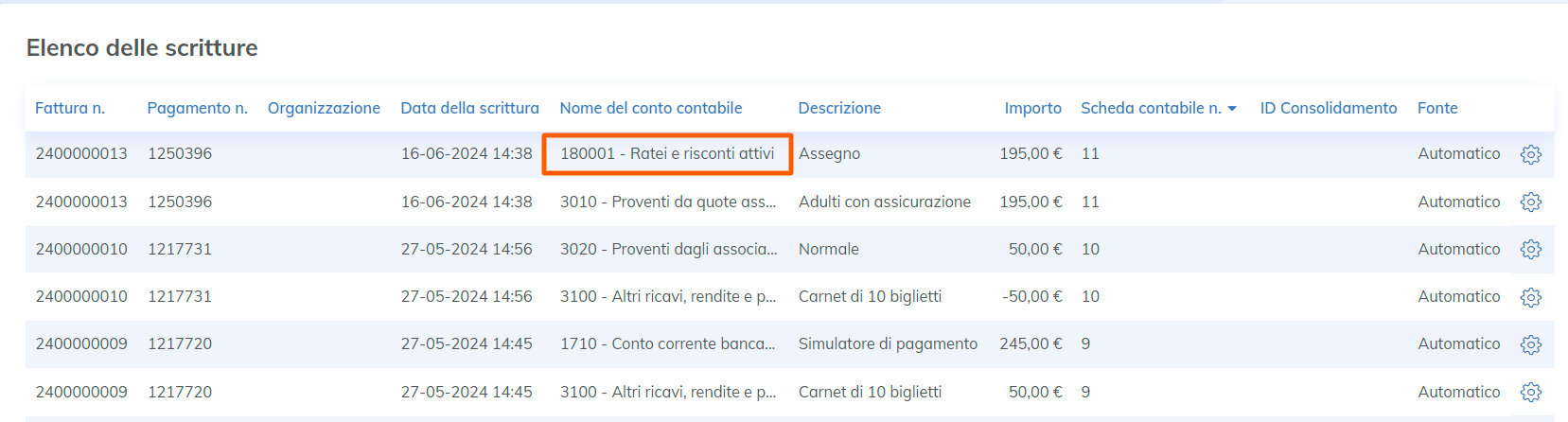 Una volta attivata la contabilità per competenza, tutti i pagamenti indiretti effettuati sul tuo sito (assegni, bonifici, ecc...) verranno registrati in «1800 - Ratei e risconti attivi».