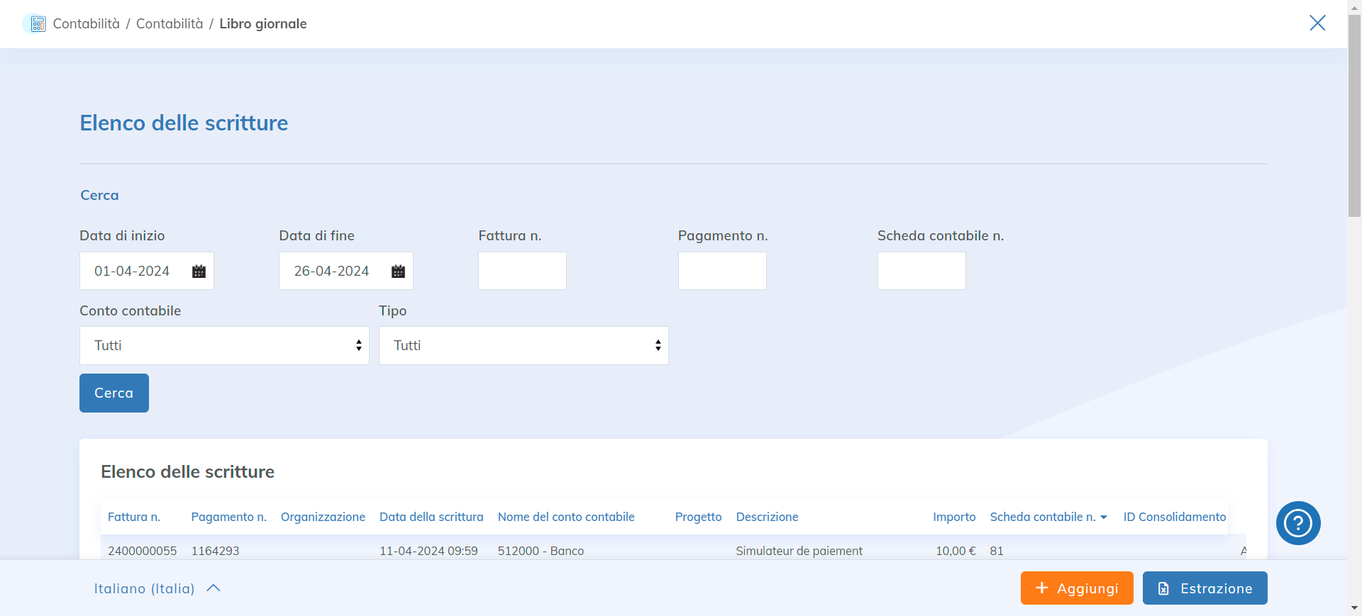 Nella funzionalità Contabilità, tutte le scritture contabili generate dalle transazioni effettuate sul tuo sito sono raggruppate.