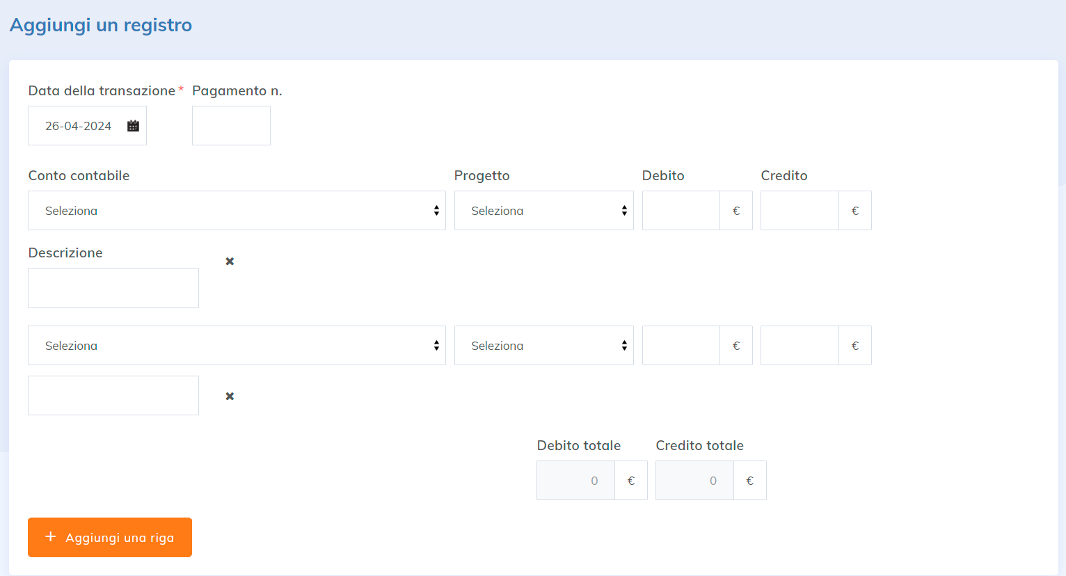 Puoi indicare la data della transazione e inserire le seguenti informazioni per ogni riga contabile:
