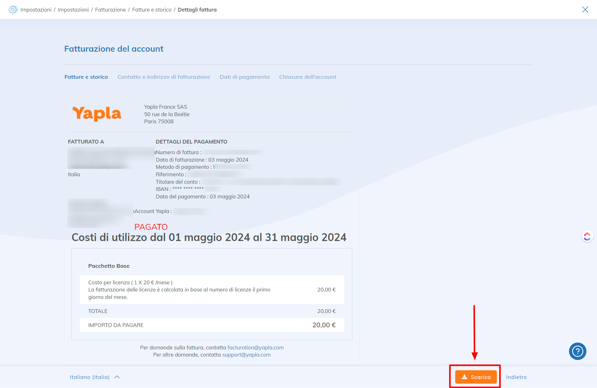 Clicca sul pulsante «Scarica» nella parte inferiore della pagina per esportare la fattura.