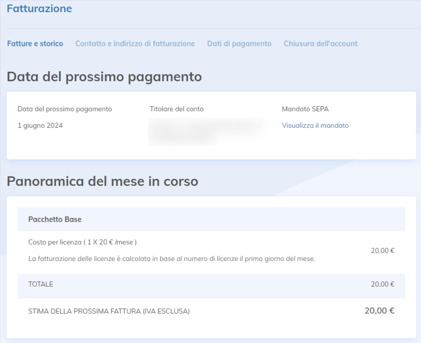 Nella configurazione del tuo account Yapla, clicca su «Fatturazione», quindi scegli il menu Fatturazione