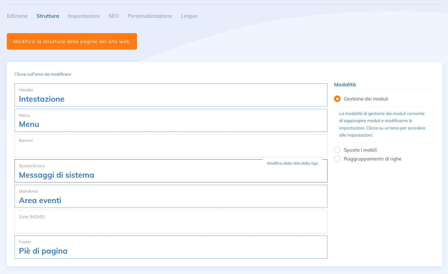 - Vai alla sottoscheda Struttura, dove troverai tutte le sezioni presenti nella pagina selezionata.