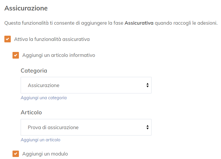 La scheda «Assicurazione» ti consente di attivare la funzionalità per un tipo di adesione specifico. Il contenuto della scheda Assicurazione deve contenere almeno un articolo o un modulo. L'articolo ti consente di descrivere le regole assicurative della tua organizzazione e il modulo ti consente di raccogliere le informazioni.